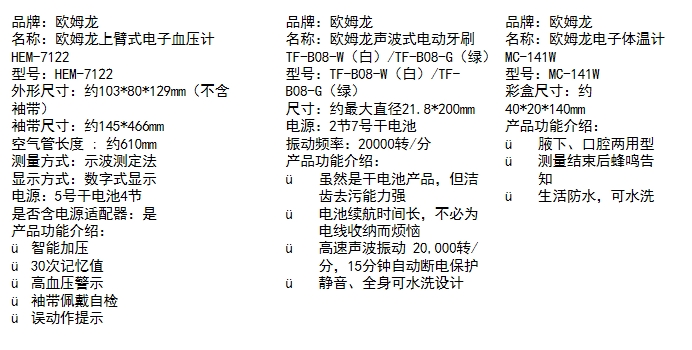 规格 :欧姆龙电子体温计MC-141*1 欧姆龙上臂式电子血压计 HEM-7122*1 欧姆龙声波式电动牙刷TF-B08-W(白)*1 欧姆龙收纳包*1