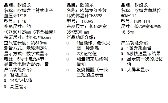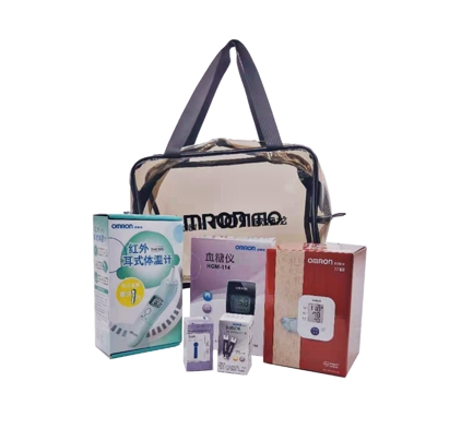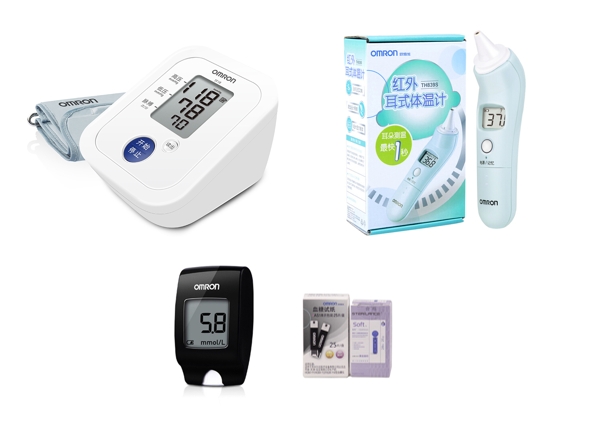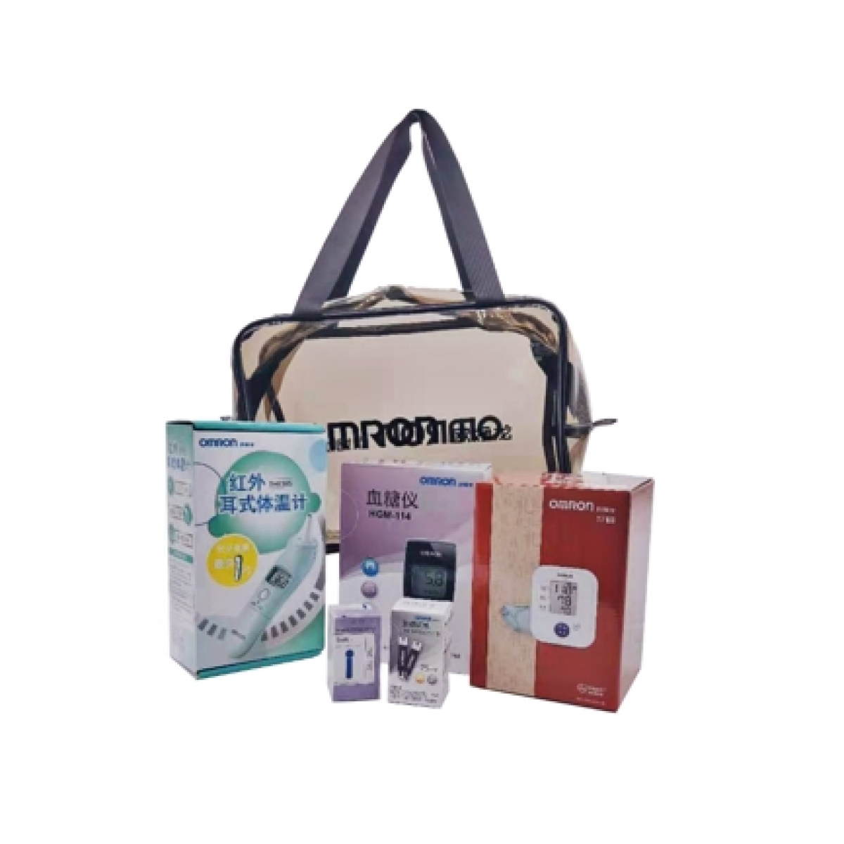 规格 :欧姆龙上臂式电子血压计TF18*1 欧姆龙红外线耳式体温计TH839S*1 欧姆龙血糖仪HGM-114*1 欧姆龙血糖仪25试纸针*1 欧姆龙PVC透明袋*1