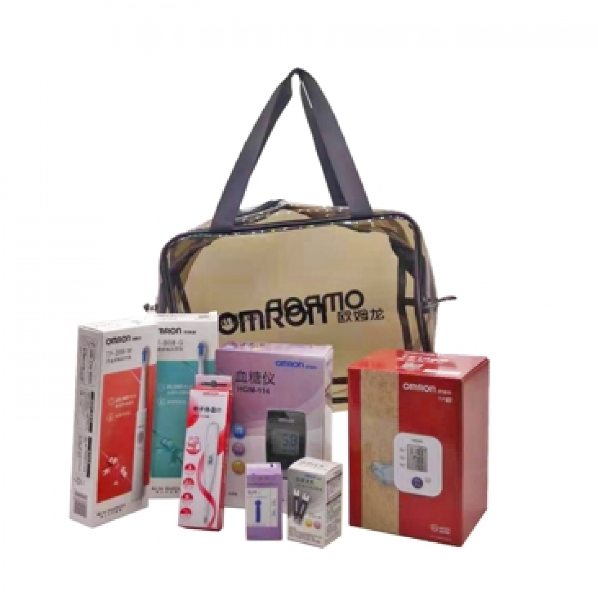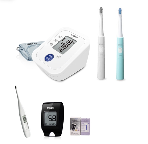欧姆龙上臂式电子血压计TF18*1 欧姆龙声波式电动牙刷TF-B08*2 欧姆龙血糖仪HGM-114*1 欧姆龙血糖仪25试纸针*1 欧姆龙电子体温计MC-141W*1 欧姆龙PVC透明袋*1