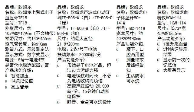 规格 :欧姆龙上臂式电子血压计TF18*1 欧姆龙声波式电动牙刷TF-B08*2 欧姆龙血糖仪HGM-114*1 欧姆龙血糖仪25试纸针*1 欧姆龙电子体温计MC-141W*1 欧姆龙PVC透明袋*1