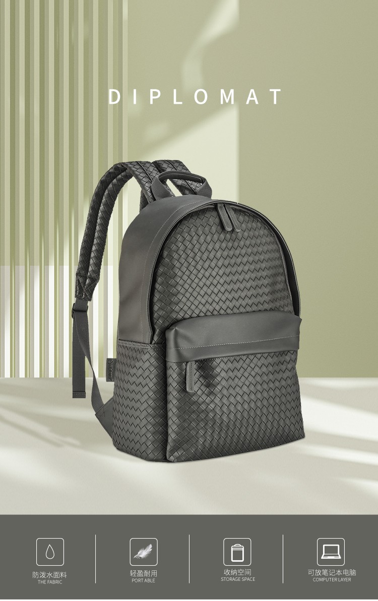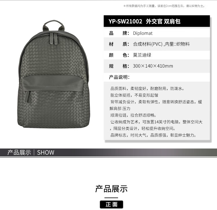商品名称:Diplomat 外交官 简约休闲编织纹双肩背包 YP-SW21002 莫兰迪绿 300*140*410mm