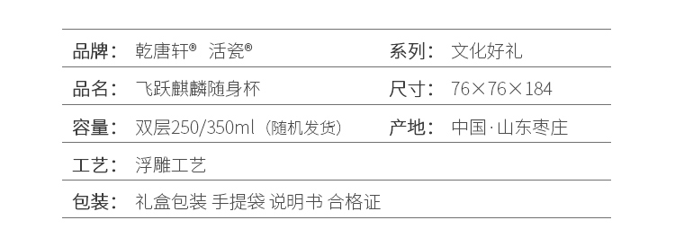 商品名称:乾唐轩 飞跃麒麟随身杯 330ml (双层)