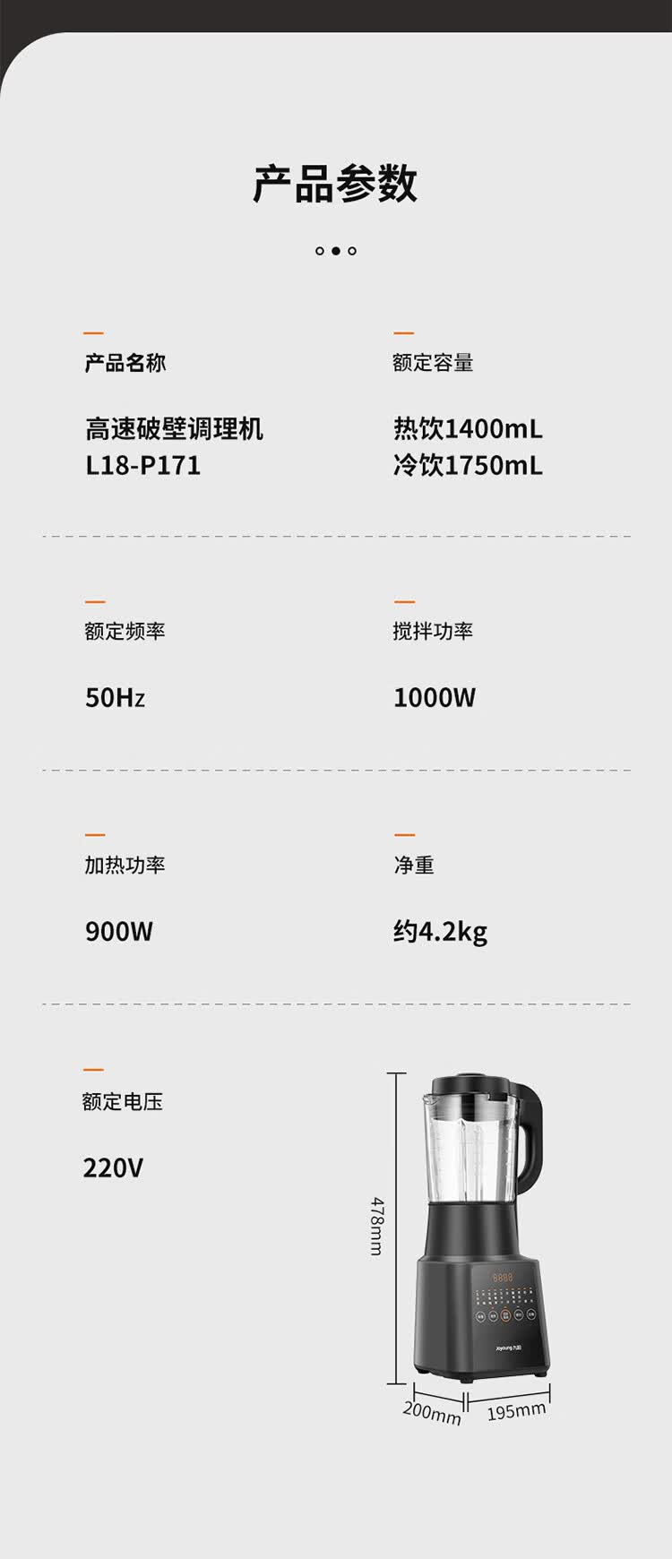 商品名称:九阳(Joyoung)高速破壁调理机 L18-P171 1400mL /1750mL