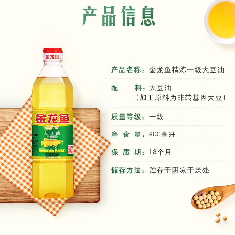 商品名称:金龙鱼精炼一级大豆油900ml(非转基因)