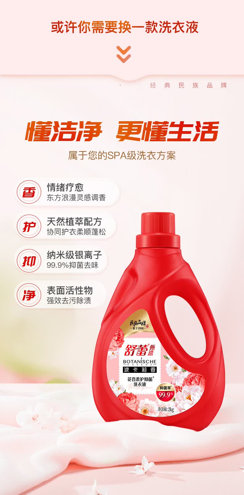 商品名称:舒蕾 波卡莉香花香柔护抑菌洗衣液2KG