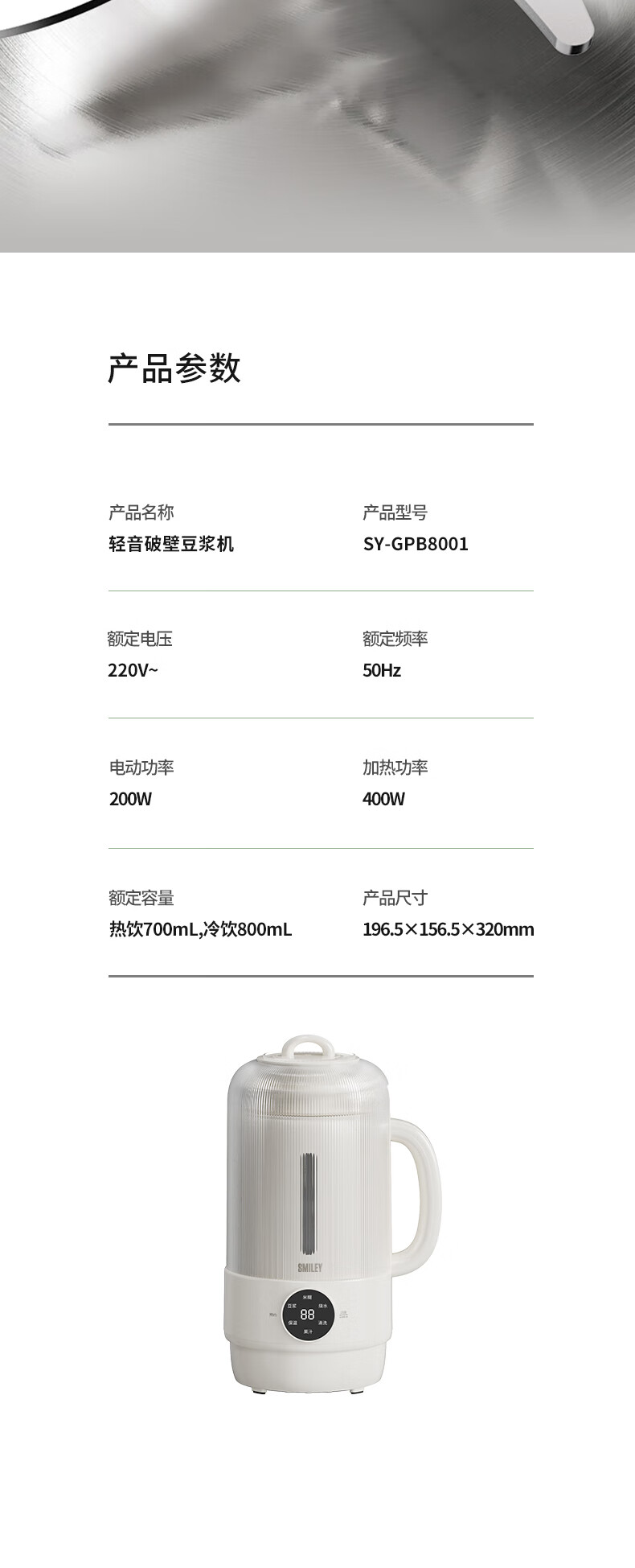 商品名称:笑脸 SMILEY 轻音破壁机 SY-GPB8001 热饮700mL,冷饮800mL