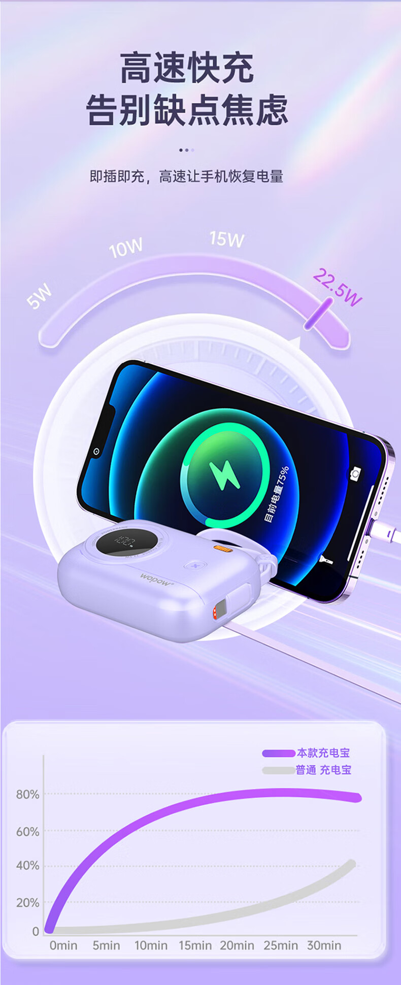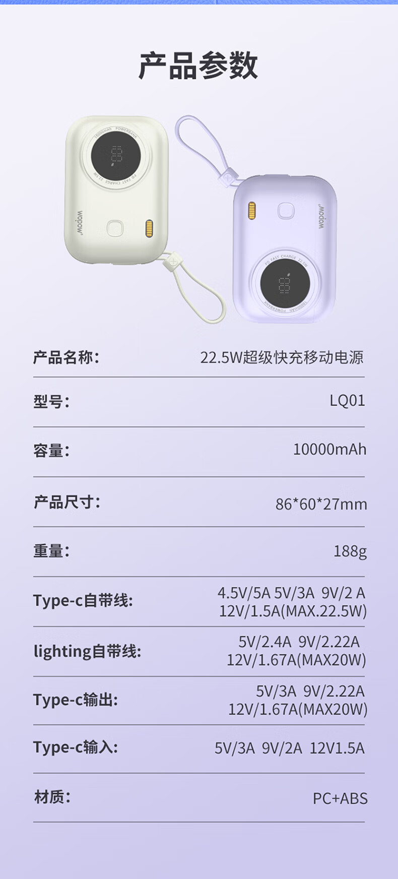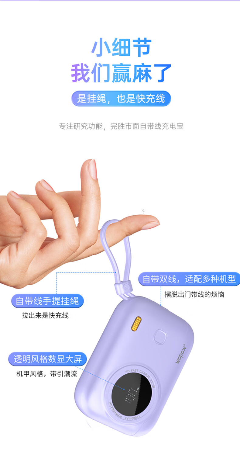 商品名称:WOPOW沃品 小相机自带线22.5W超级快充+PD20W快充移动电源 LQ01