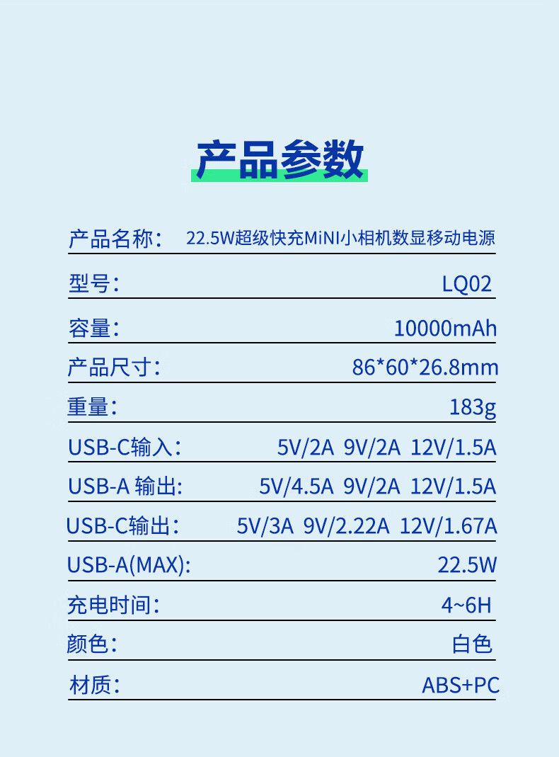 商品名称:沃品 WOPOW沃品 22.5W快充移动电源 LQ02 10000mAh