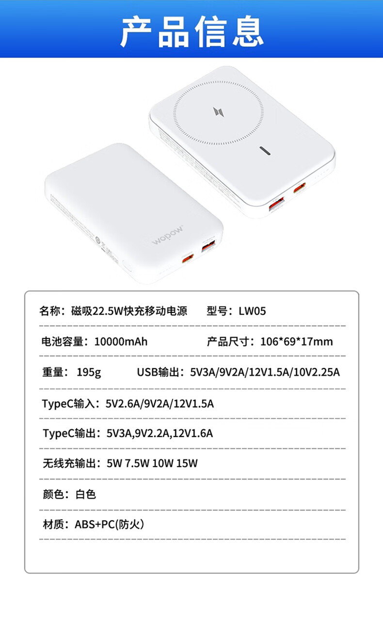 商品名称:WOPOW沃品 磁吸22.5W快充移动电源 10000mAh LW05