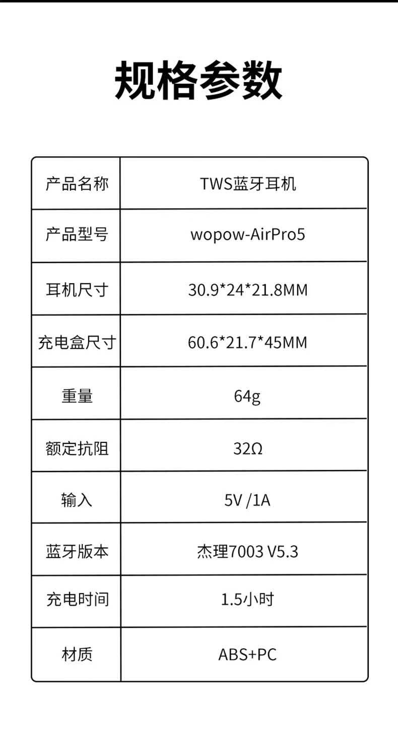 商品名称:沃品(WOPOW)TWS蓝牙耳机 AirPro5