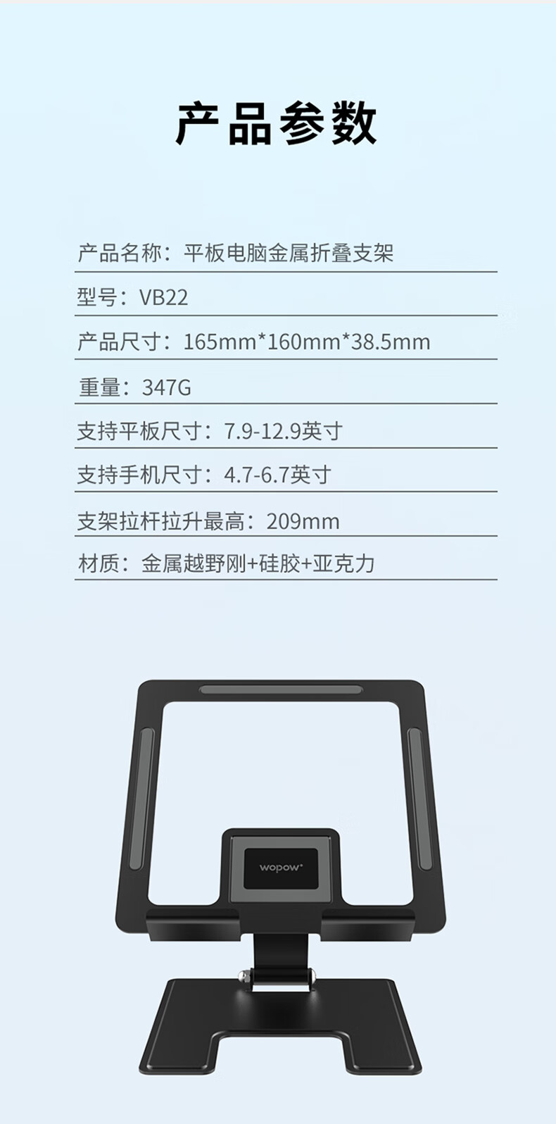商品名称:WOPOW沃品 平板电脑金属折叠支架 165*160*38.5mm VB22