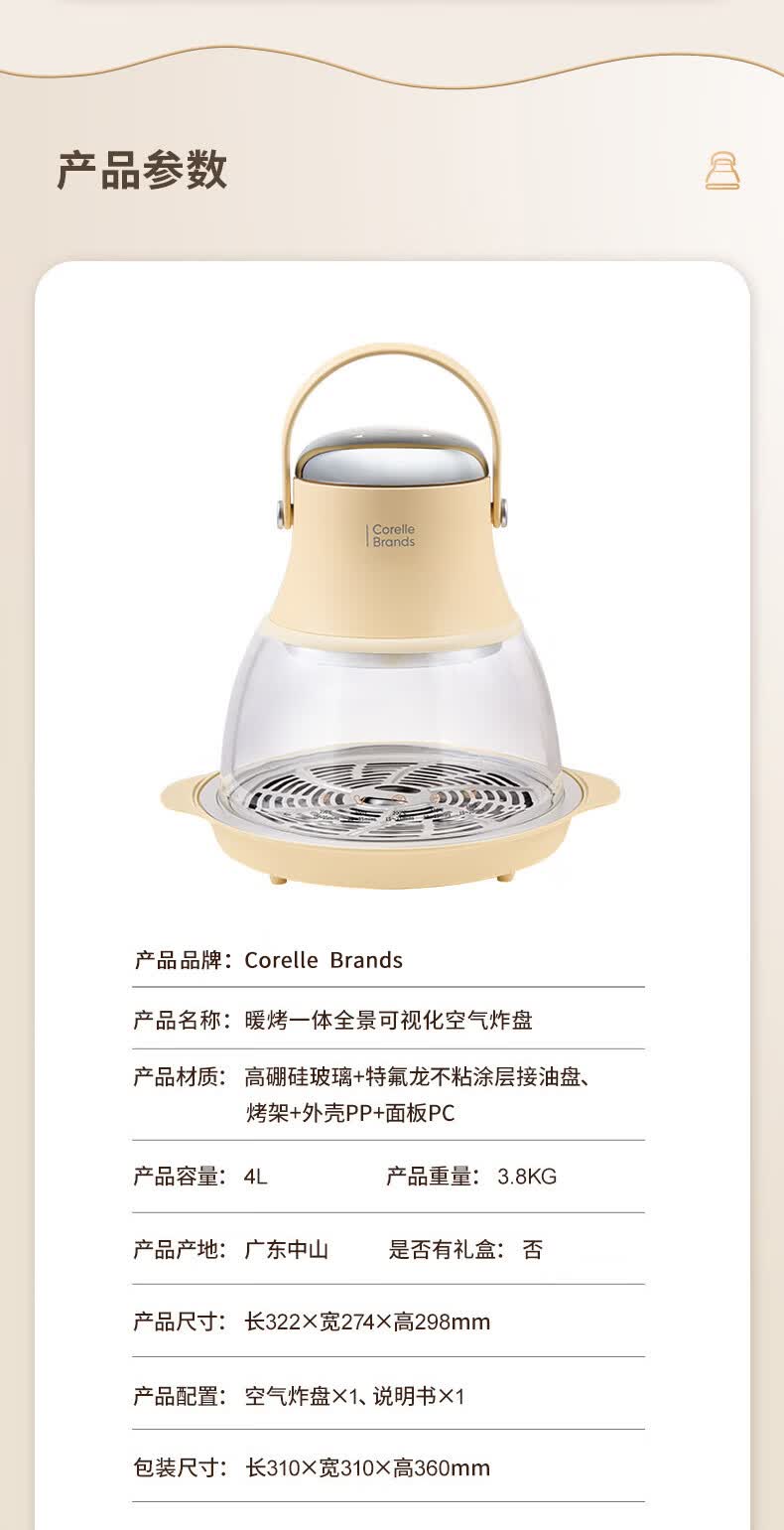 商品名称:康宁 Corelle Brands暖烤一体可视化空炸盘 CB-NKYTKQZG/KZ 4L