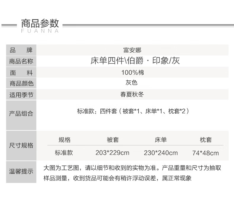 商品名称:富安娜 素提四件套/伯爵.印象 被套203*229cm