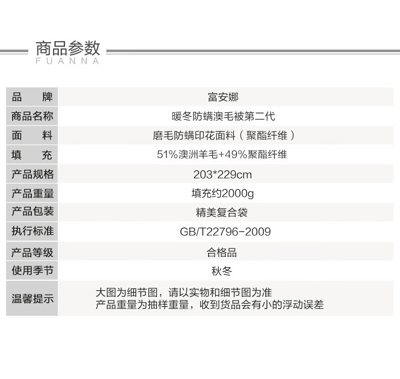商品名称:富安娜(FUANNA)羊毛被-暖冬澳毛被二代 203*229cm(2000g)