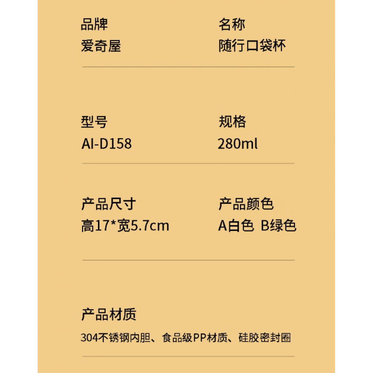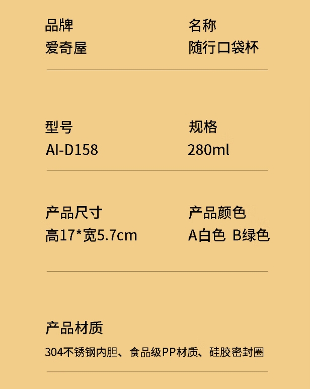 商品名称:爱奇屋 随行口袋杯 AI-D158 280ml