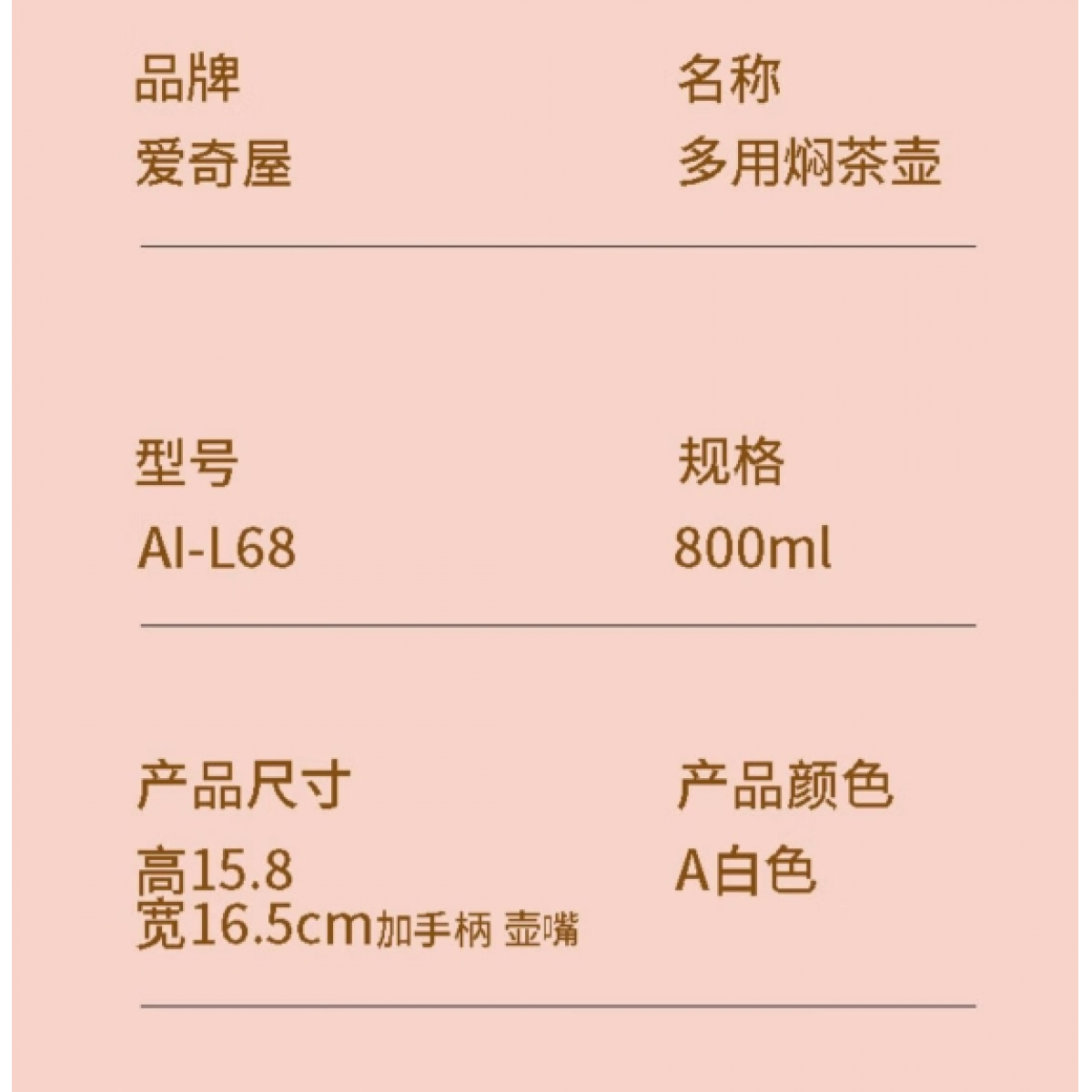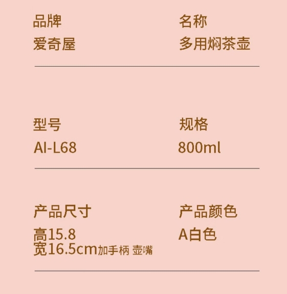 商品名称:爱奇屋 多用焖茶壶 AI-L68 800ml