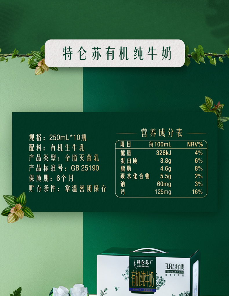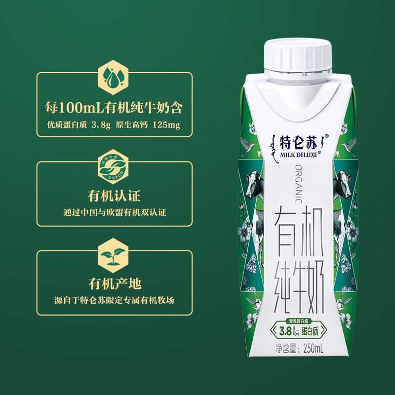 商品名称:蒙牛|特仑苏有机纯牛奶全脂灭菌乳利乐梦幻盖250ml×10盒