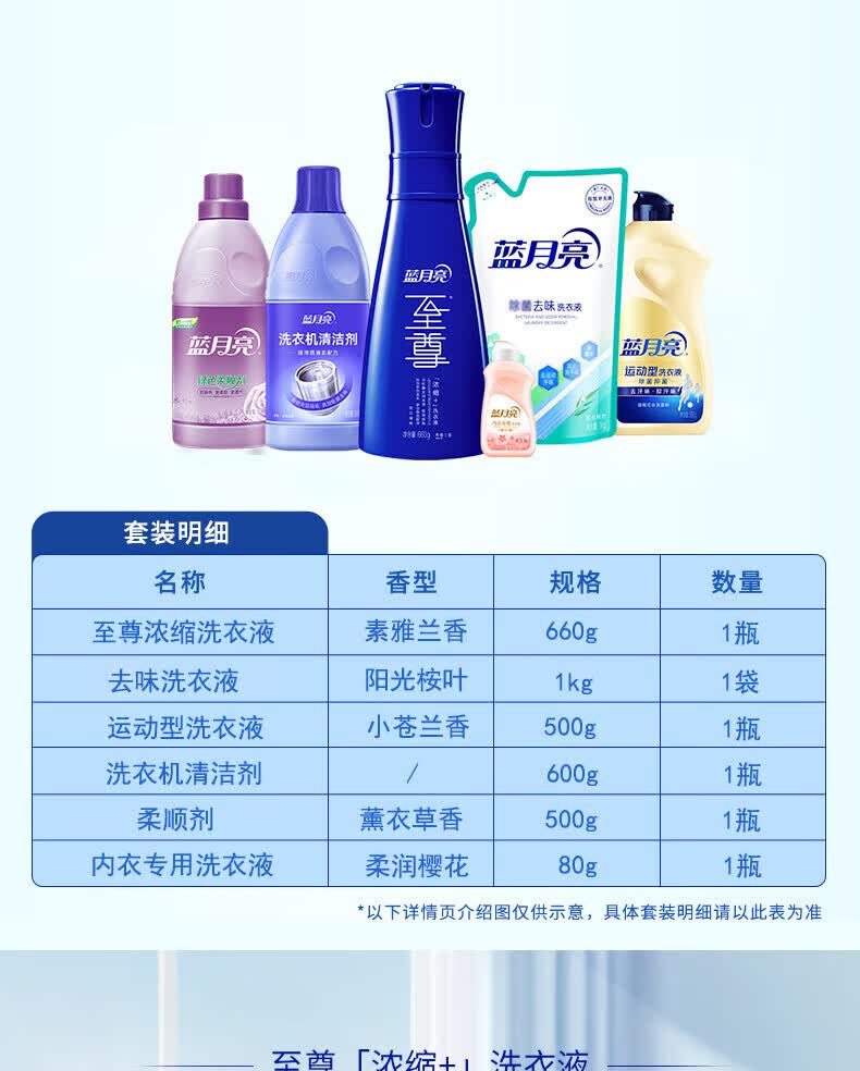 包装数量 :660g至尊+500g柔顺剂+600g清洁+1kg除菌洗+500g运动洗+80g内衣洗