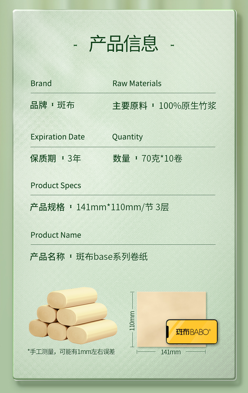 商品名称:斑布 BASE系列无芯无膜卷纸 BCW70B10 70克*10卷