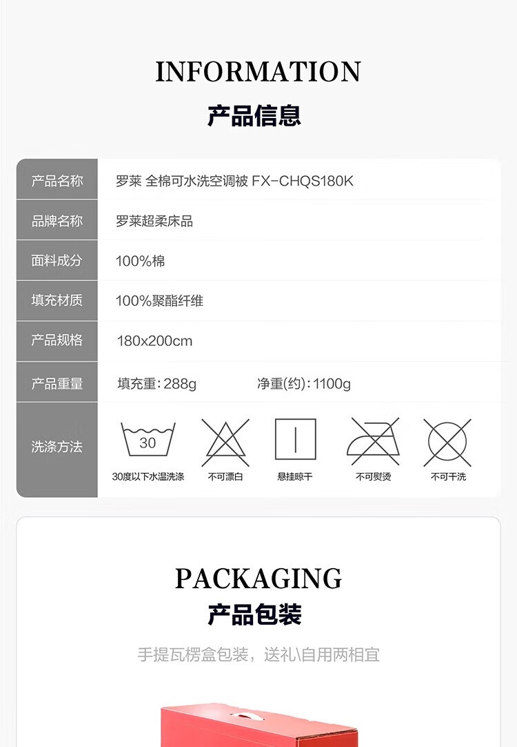 商品名称:罗莱 全棉可水洗空调被 288g 180*200cm FX-CHQS180K