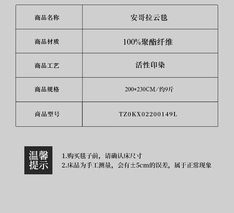 商品名称:伊伊爱 安哥拉云毯200*230cm约9斤 TZ0KX02200149L