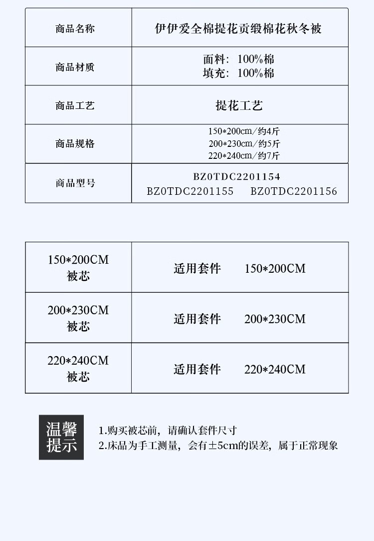 商品名称:伊伊爱 全棉提花贡缎棉花秋冬被200*230cm约5.2斤 BZ0TDC2201155