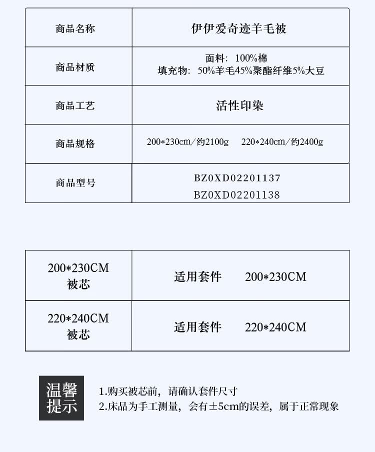 商品名称:伊伊爱 奇迹羊毛被200*230cm约4.2斤 BZ0XD02201137