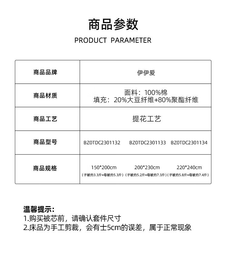 商品名称:伊伊爱 全棉贡缎提花大豆子母被200*230cm(子被5.2斤+母被7.3斤)BZ0TDC2301133