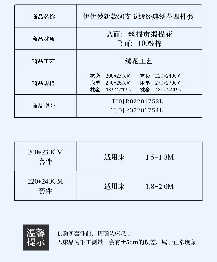 商品名称:伊伊爱 贡缎60S经典绣花四件套200*230cm TJ0JR02201753L