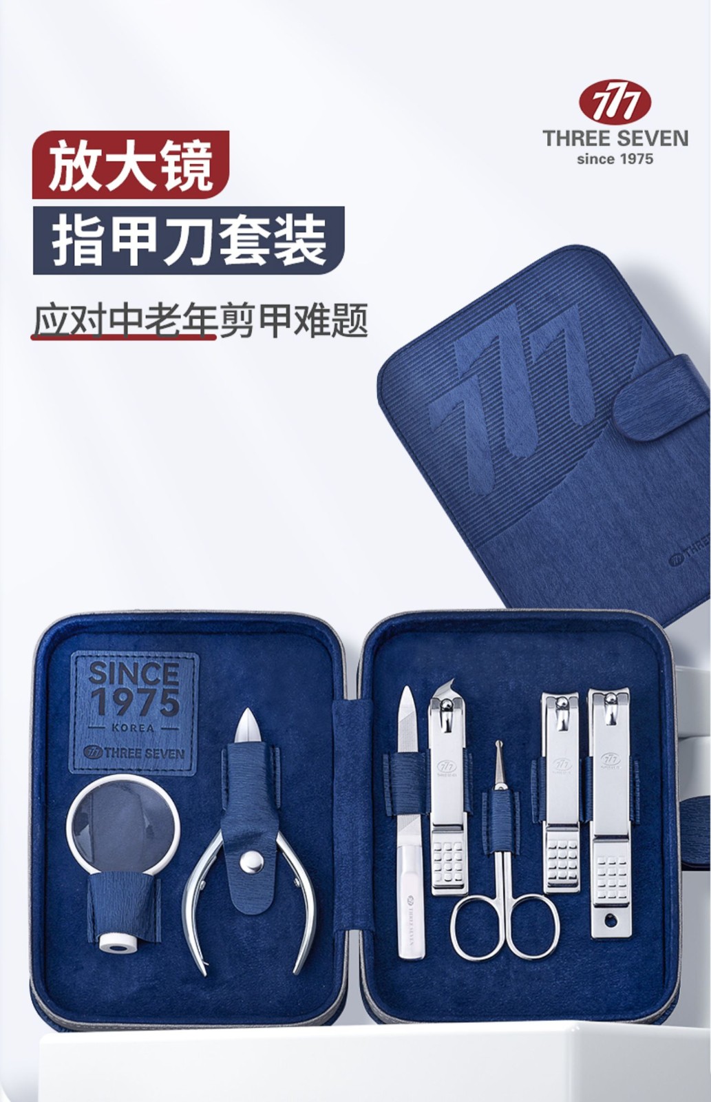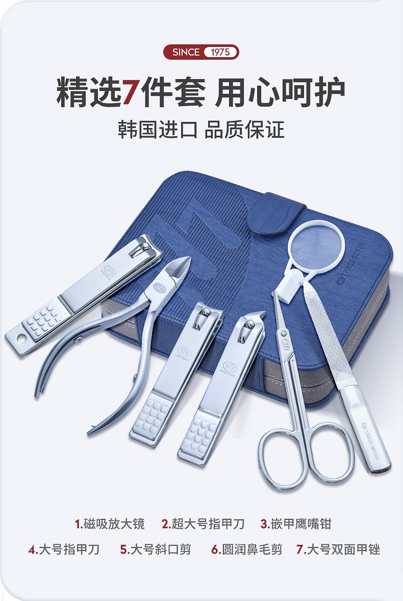 包装清单 :7件套(特大号指甲刀、大号指甲刀、大号斜口剪、鼻毛剪、指甲锉、磁吸3倍放大镜、鹰嘴钳)