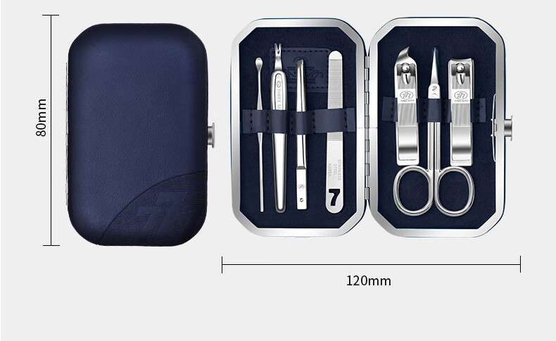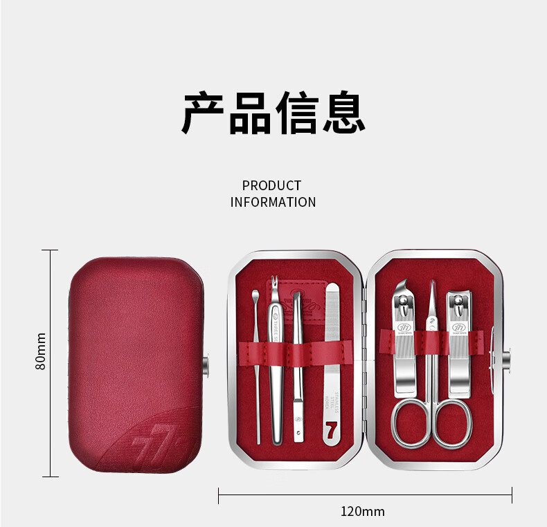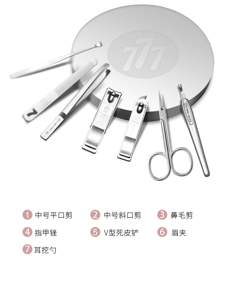 包装清单 :平口指甲刀 | 斜口指甲刀 | 死皮铲 | 眉夹 | 修容剪 | 指甲锉 | 耳挖