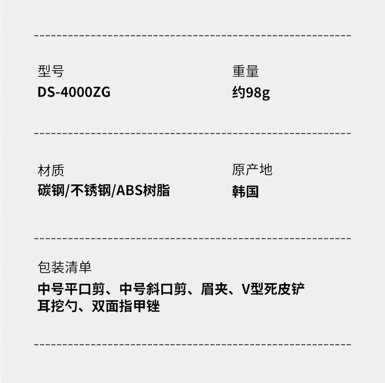 包装清单 :6件套(死皮铲、耳挖、指甲锉、指甲刀、眉夹、斜口指甲刀)