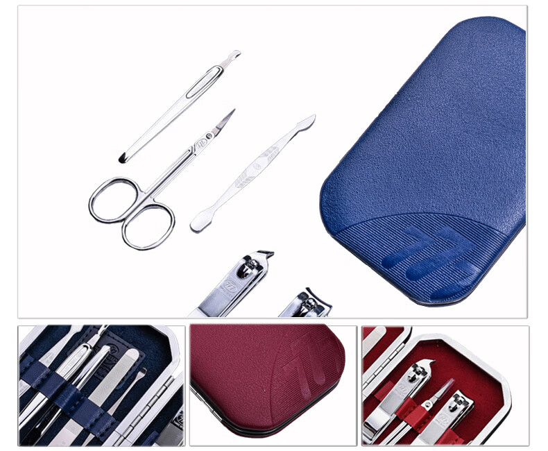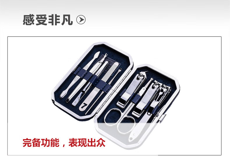 包装清单 :平口指甲刀 | 斜口指甲刀 | 长柄指甲刀 | 死皮铲 | 鼻毛剪 | 耳挖 | 指甲锉 | 眉夹 | 双面死皮推