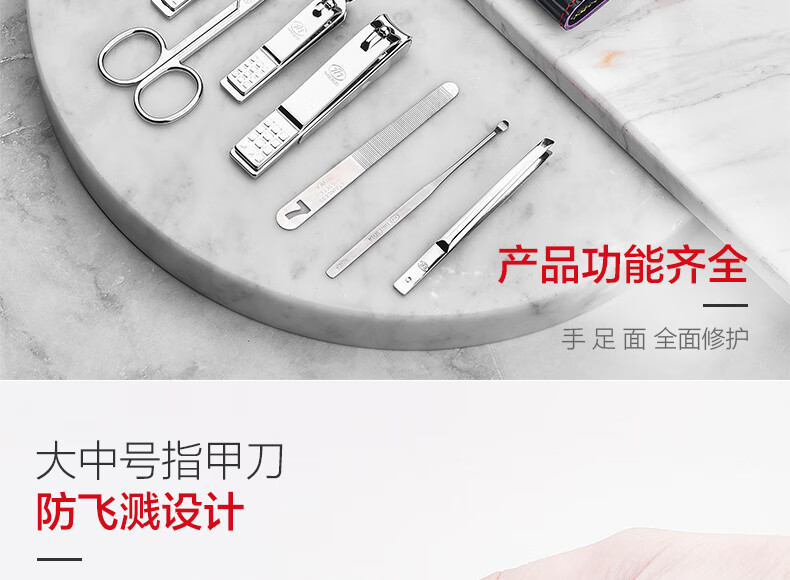 包装清单 :9件套(锉、耳挖、镊子、两面死皮推、死皮铲、斜口指甲刀、眉剪、 手部指甲刀、足部指甲刀)