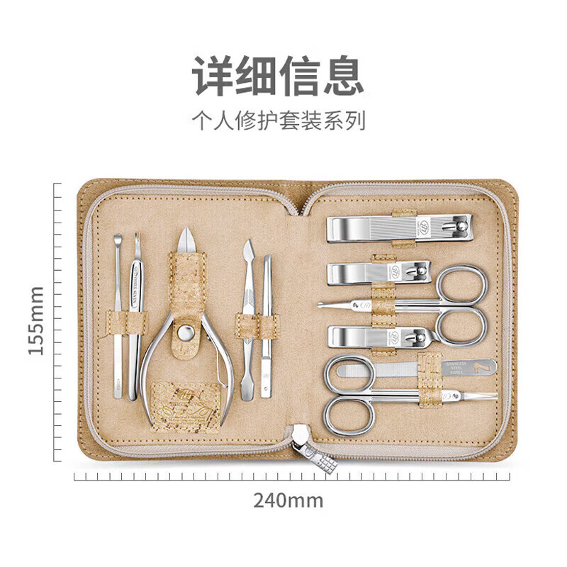 包装清单 :11件套 (指甲锉、耳挖、鼻毛剪、双头死皮刀、死皮铲、眉夹、斜口指甲刀、修容剪、指甲刀、趾甲刀、死皮钳)