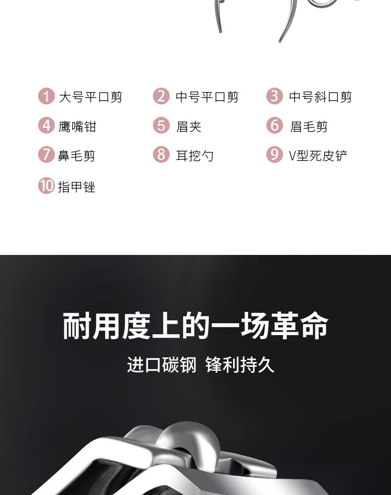 包装清单 :平口指甲刀 | 斜口指甲刀 | 大号指甲刀 | 鹰嘴钳 |眉夹 | 死皮推 | 修容剪 | 鼻毛剪 | 指甲挫 | 耳挖