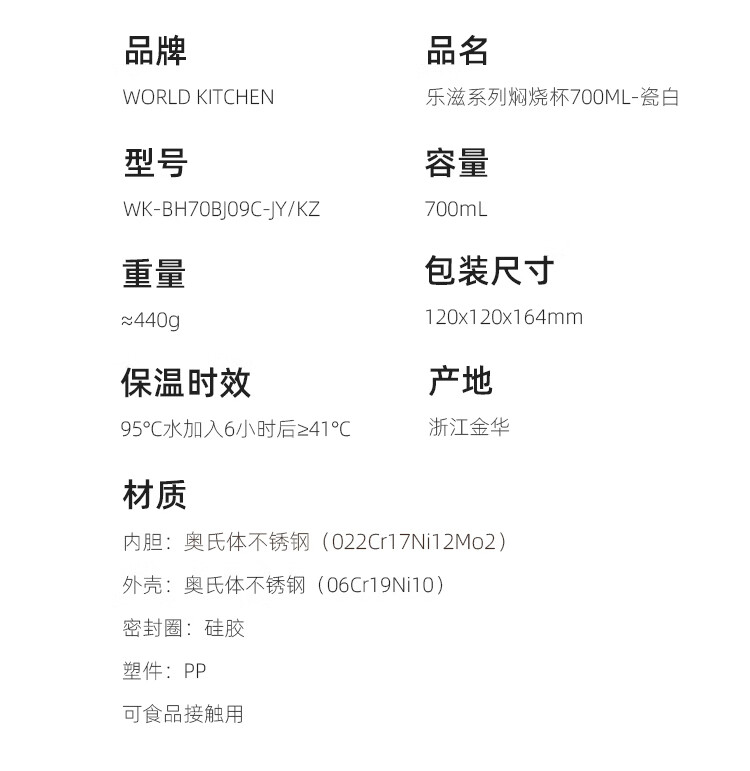 商品名称:康宁 乐滋系列焖烧杯700ML-瓷白 WK-BH70BJ09C-JY/KZ