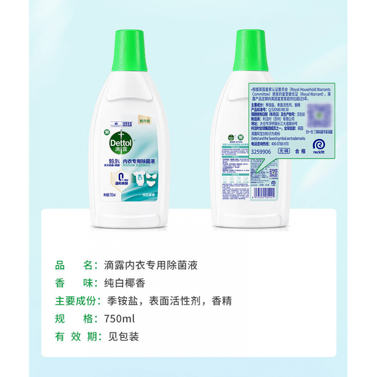 商品名称:滴露(Dettol)内衣专用除菌液椰香750ml
