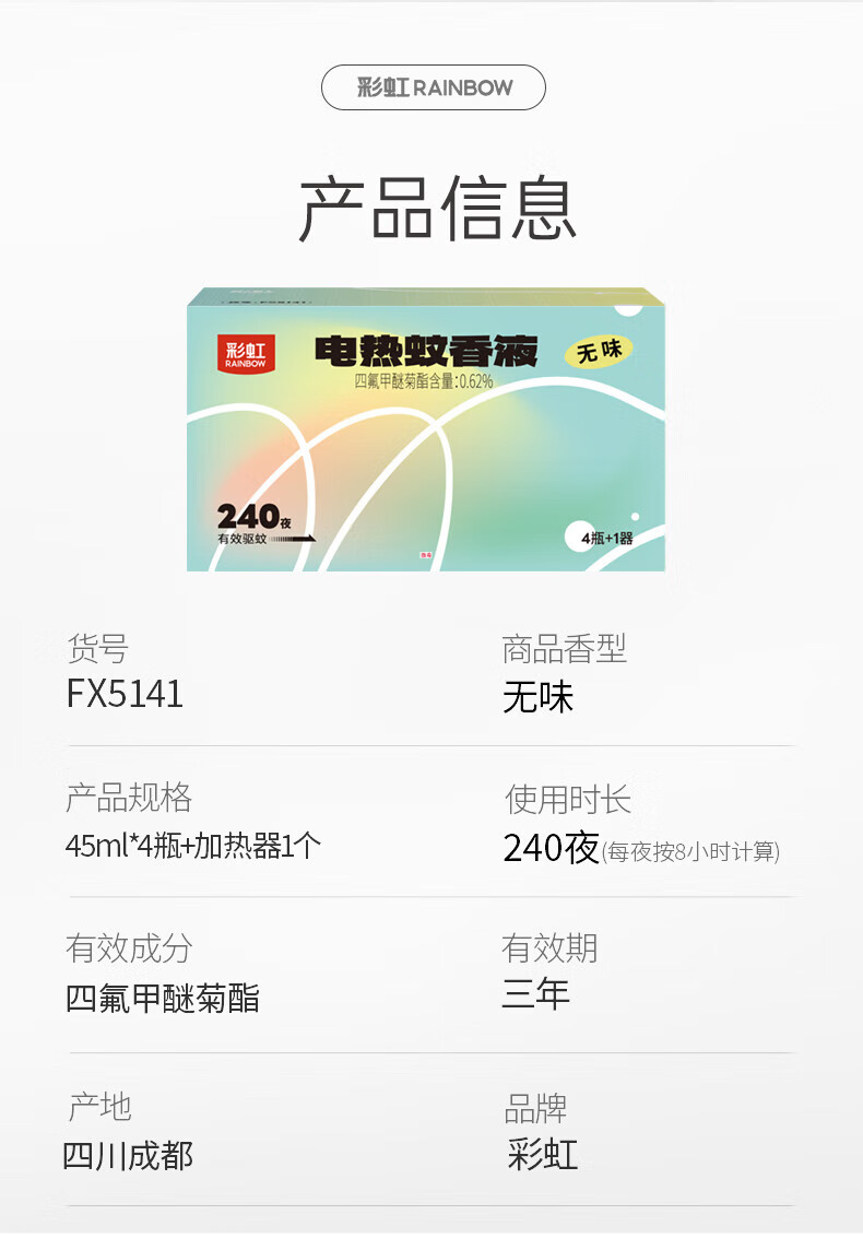 商品名称:彩虹 蚊香液直插器超值装(4+1)无味 FX5141