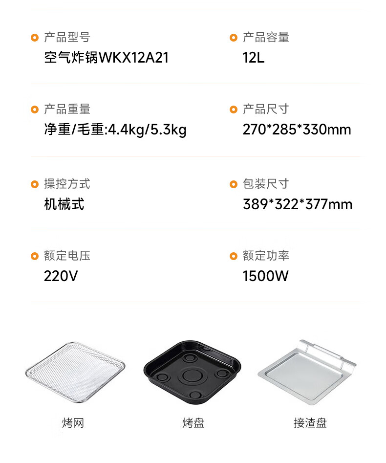 商品名称:西屋 Westinghouse 空气炸烤箱 WKX12A21 12L