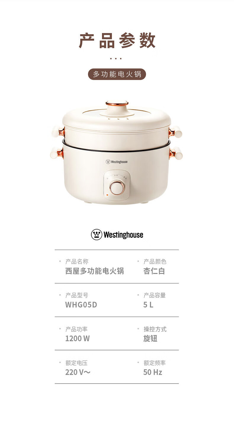 商品名称:西屋 Westinghouse 多功能电火锅 WHG05D 5L