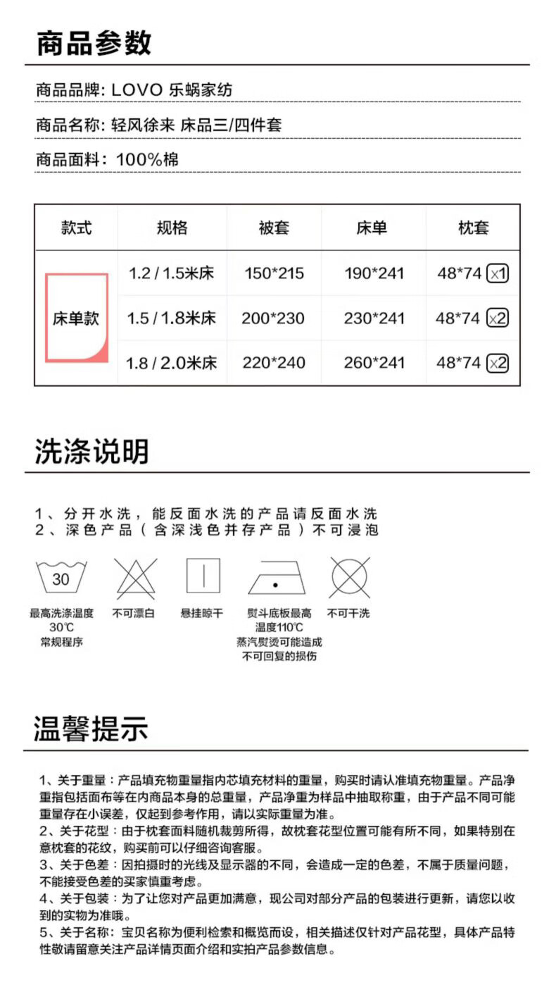 商品名称:罗莱家纺LUOLAI 全棉斜纹四件套 LV-002 轻风徐来 200x230(cm)x1