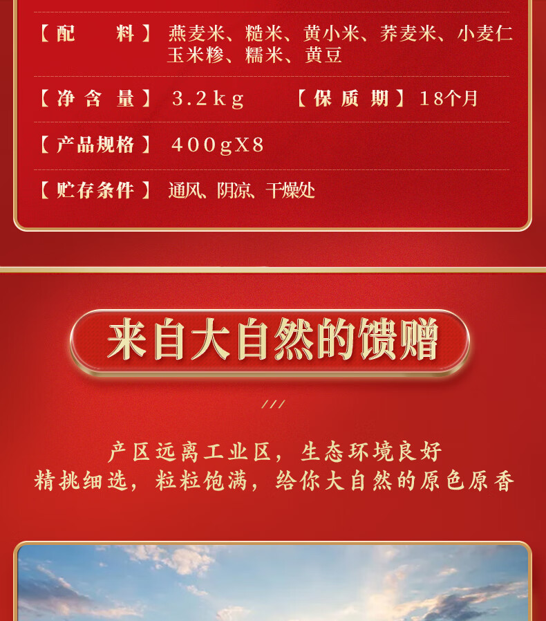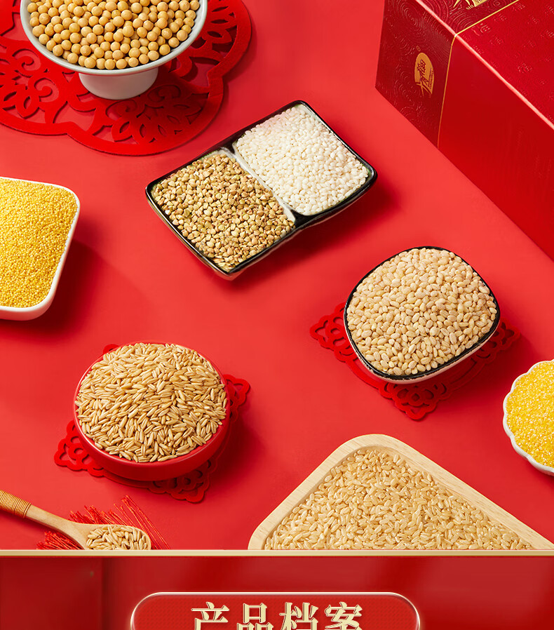 包装清单 :黄小米.糯米.糙米.荞麦米.燕麦米.黄豆.玉米渣.小麦仁(各400g)