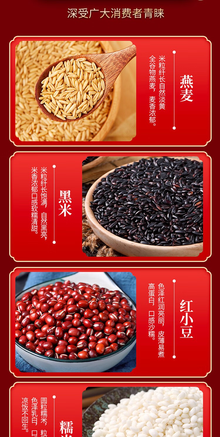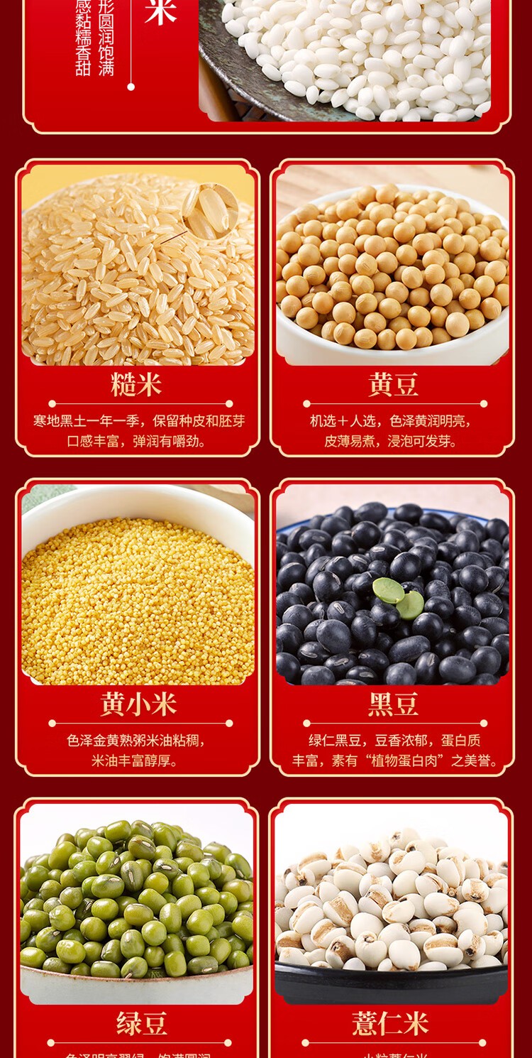 黑米480g、糯米480g、燕麦米480g、黄小米480g 、绿豆450g、糙米480g、红小豆450g、薏仁米420g、黄豆380g、黑豆380g