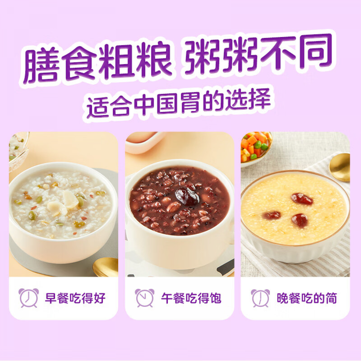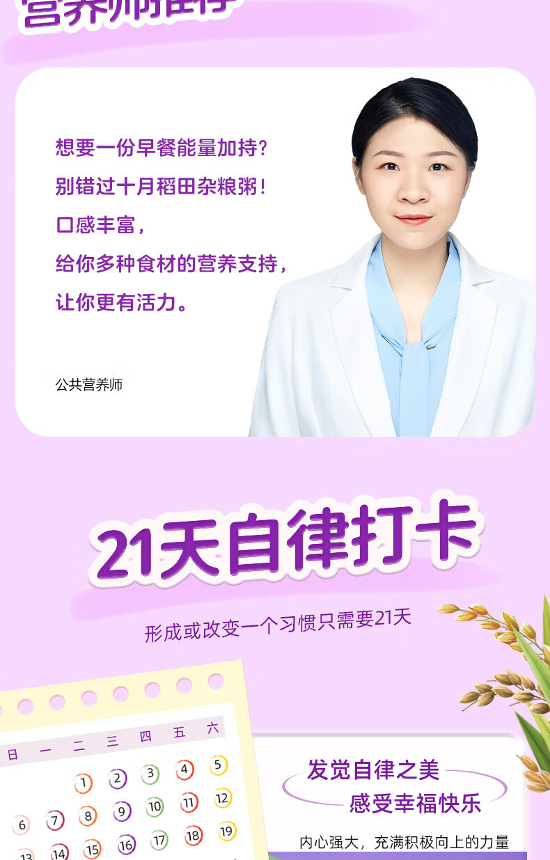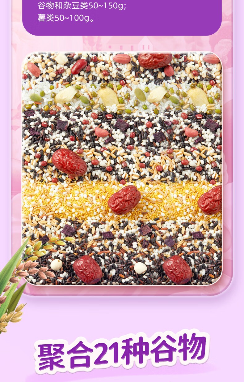 包装清单 :红枣小米粥、八宝粥、紫薯黑米粥、绿豆百合粥、银耳燕麦紫薯粥、红豆薏米粥、红枣莲子黑糯米粥(各3袋)