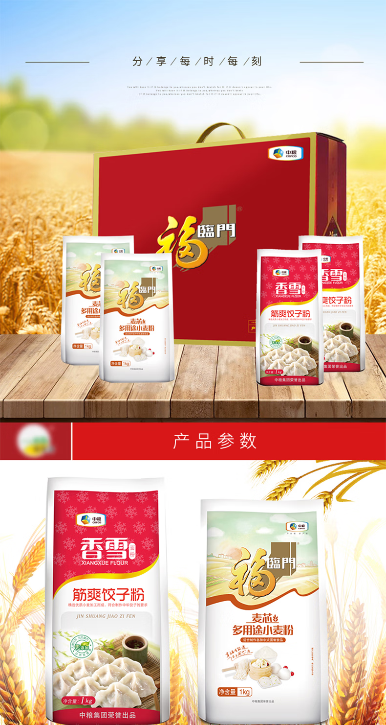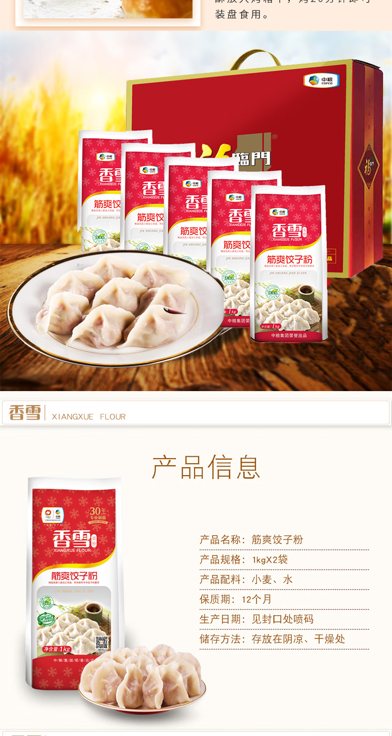 包装清单 :麦芯多用途小麦粉1kg*2袋 筋爽饺子粉1kg*2袋