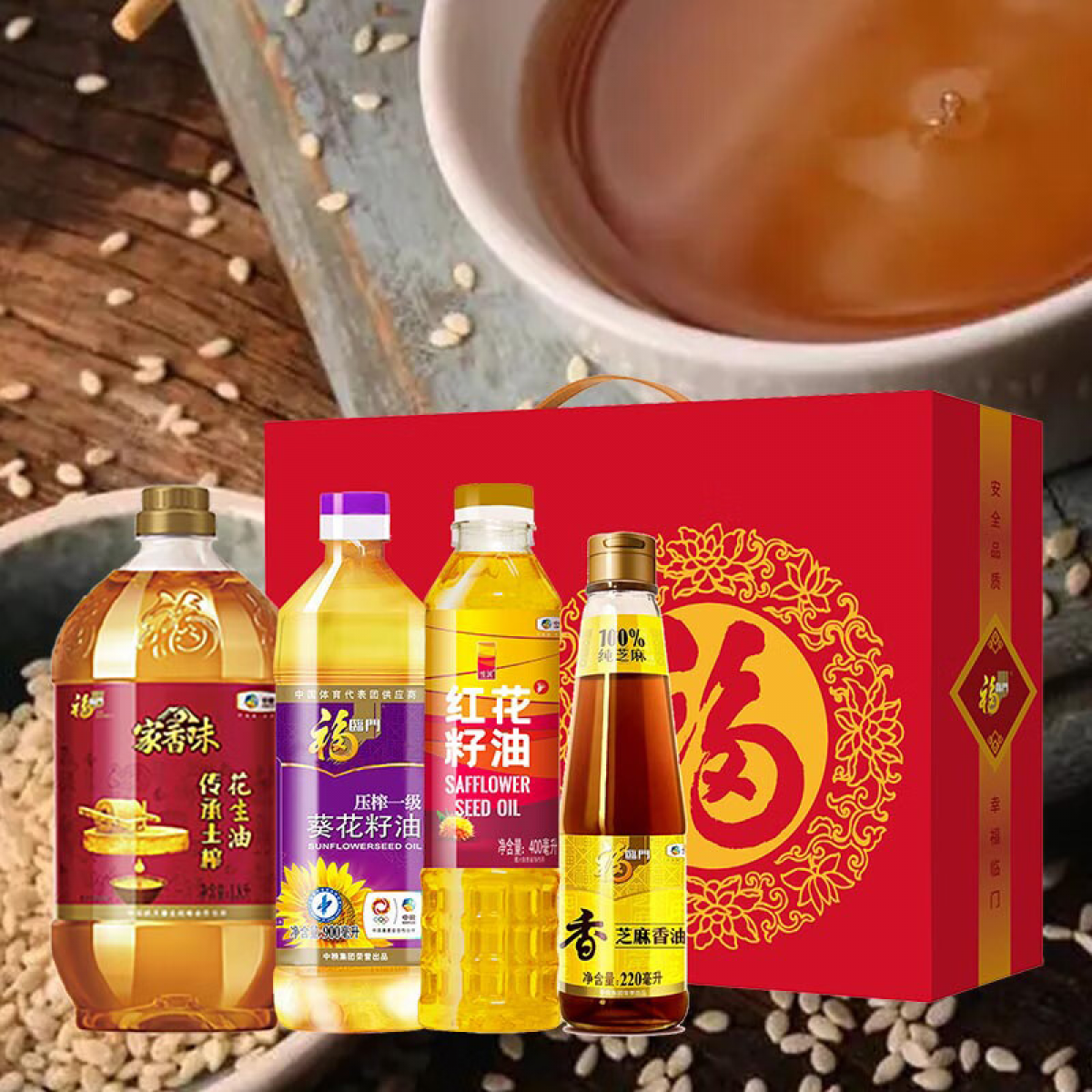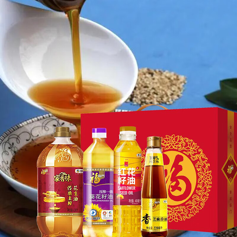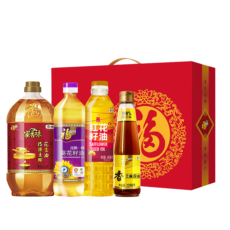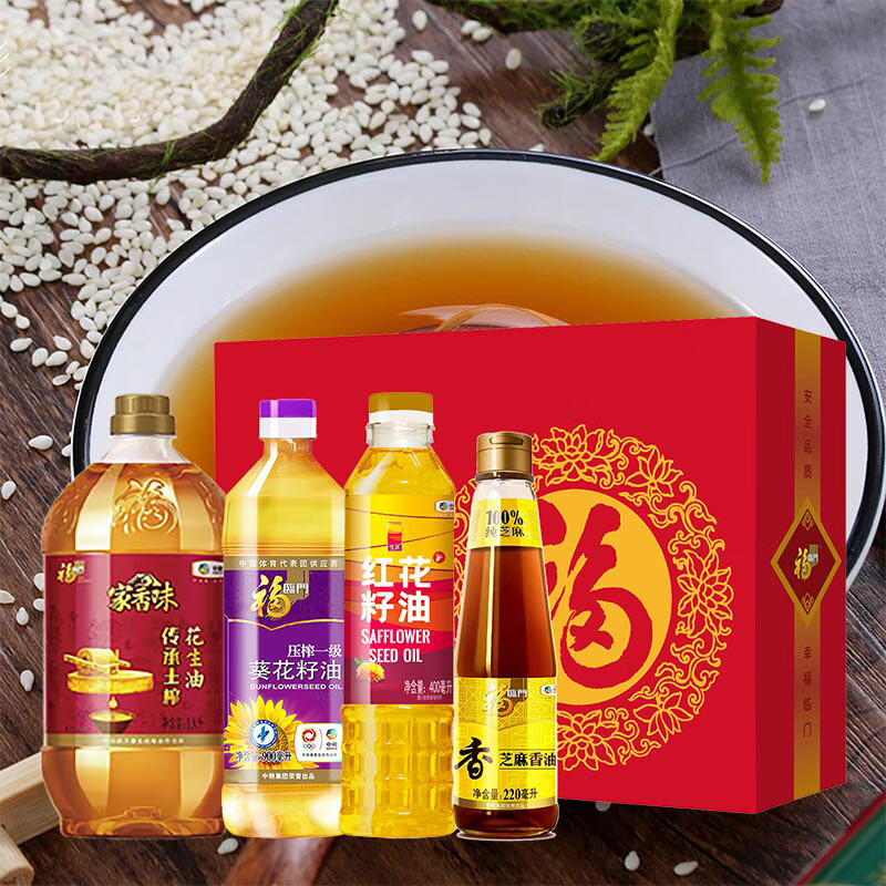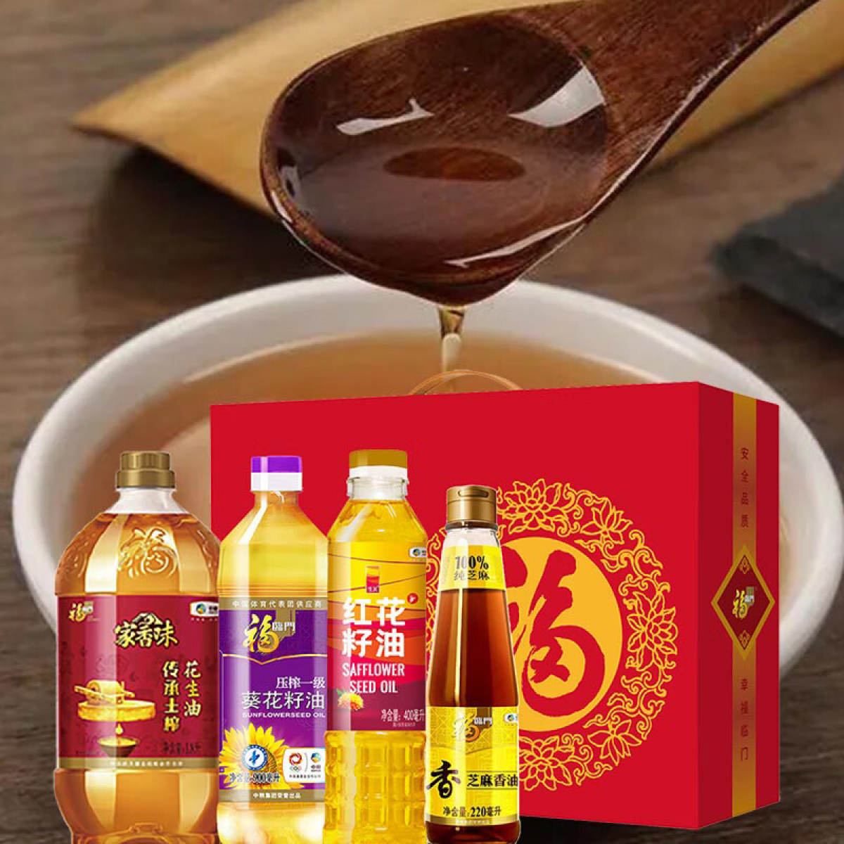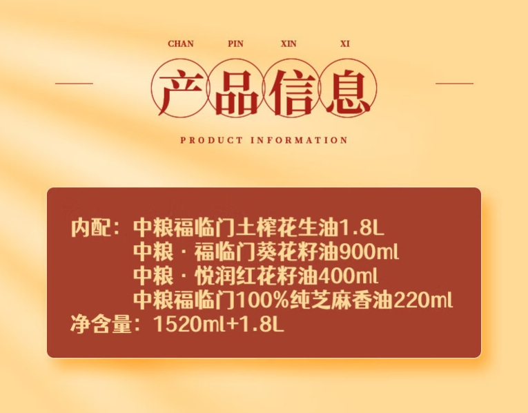 包装清单 :中粮福临门土榨花生油1.8L 中粮·福临门葵花籽油900ml 中粮·悦润红花籽油400ml 中粮福临门100%纯芝麻香油220ml