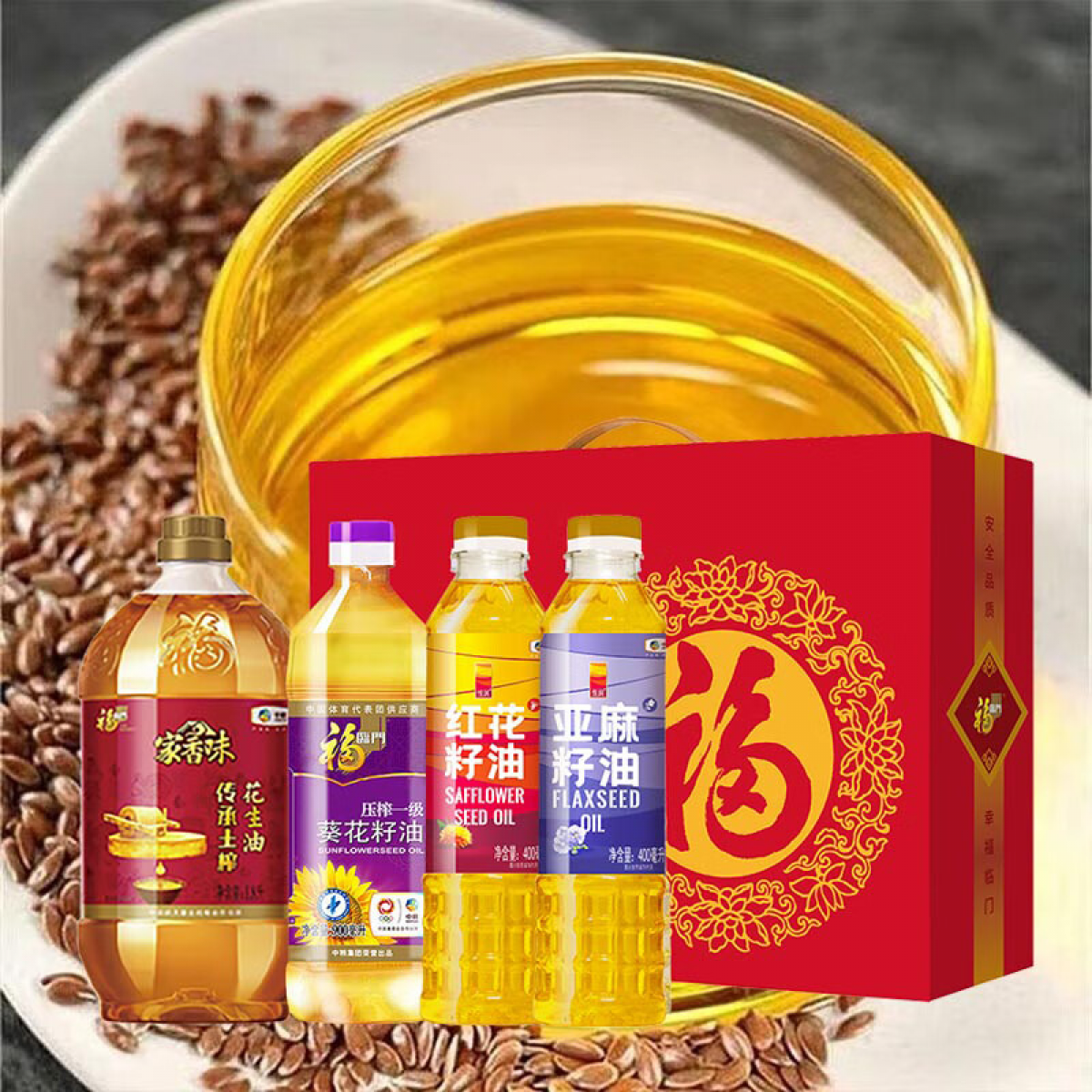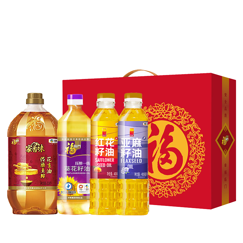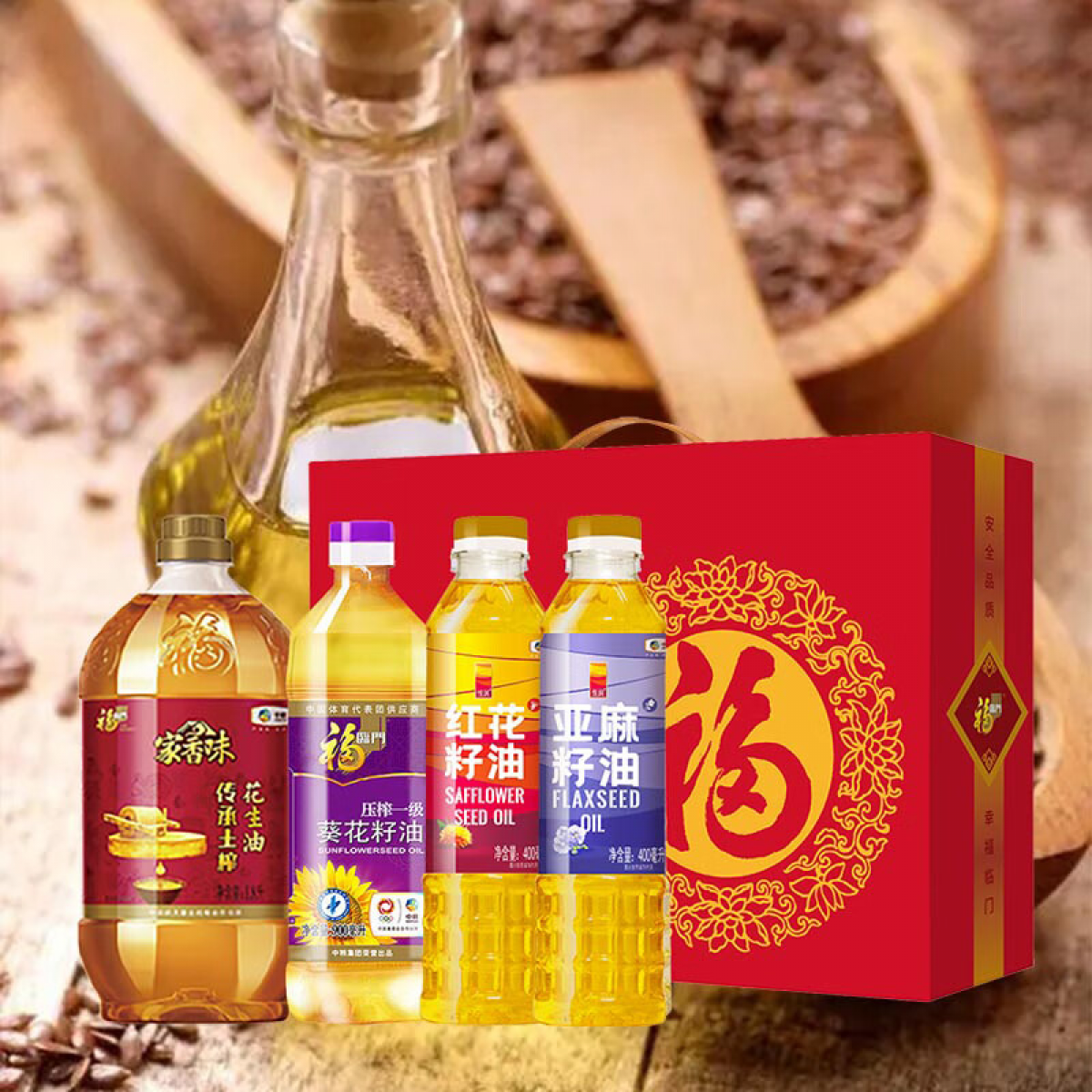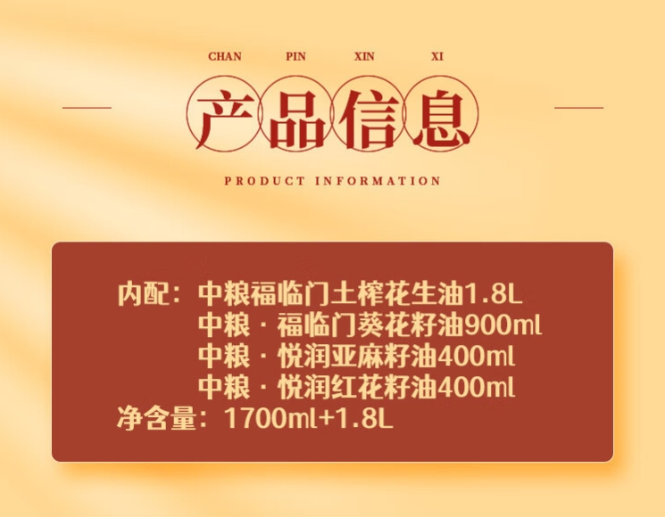 包装清单 :中粮福临门土榨花生油1.8L 中粮·福临门葵花籽油900ml 中粮·悦润亚麻籽油400ml 中粮·悦润红花籽油400ml