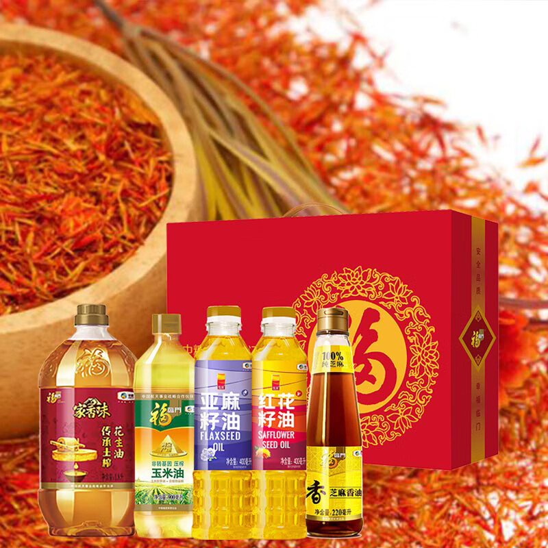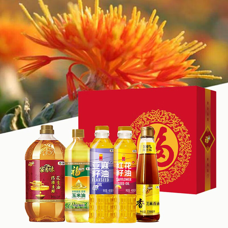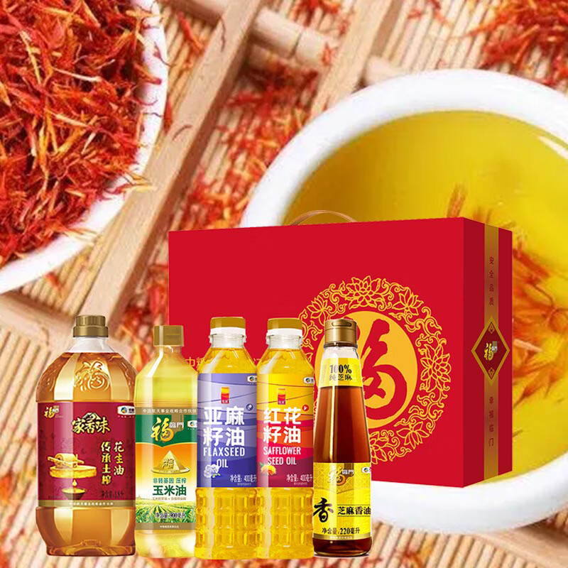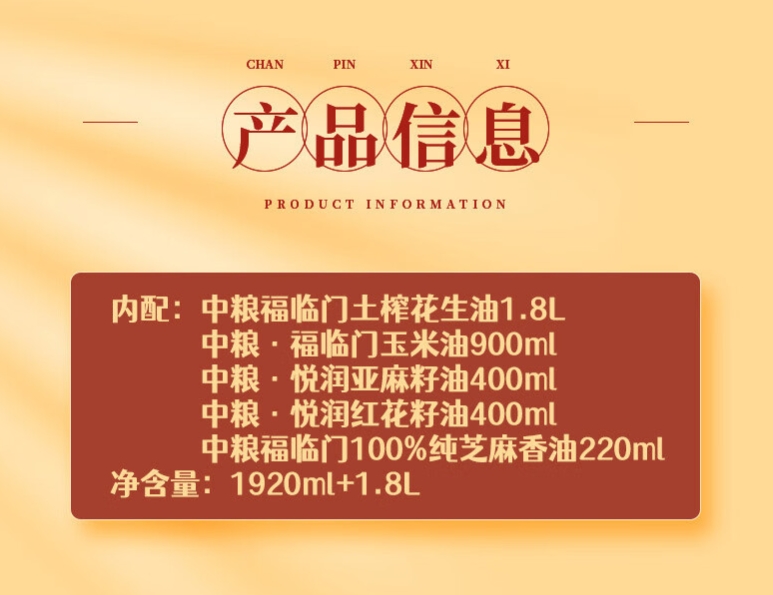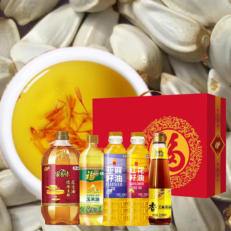 包装清单 :中粮福临门土榨花生油1.8L 中粮·福临门玉米油900ml 中粮·悦润亚麻籽油400ml 中粮·悦润红花籽油400ml 中粮福临门100%纯芝麻香油220ml