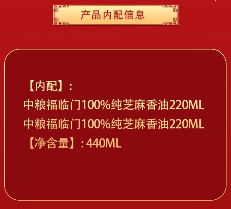 商品名称:中粮 福临门100%纯芝麻香油礼盒A 440ml